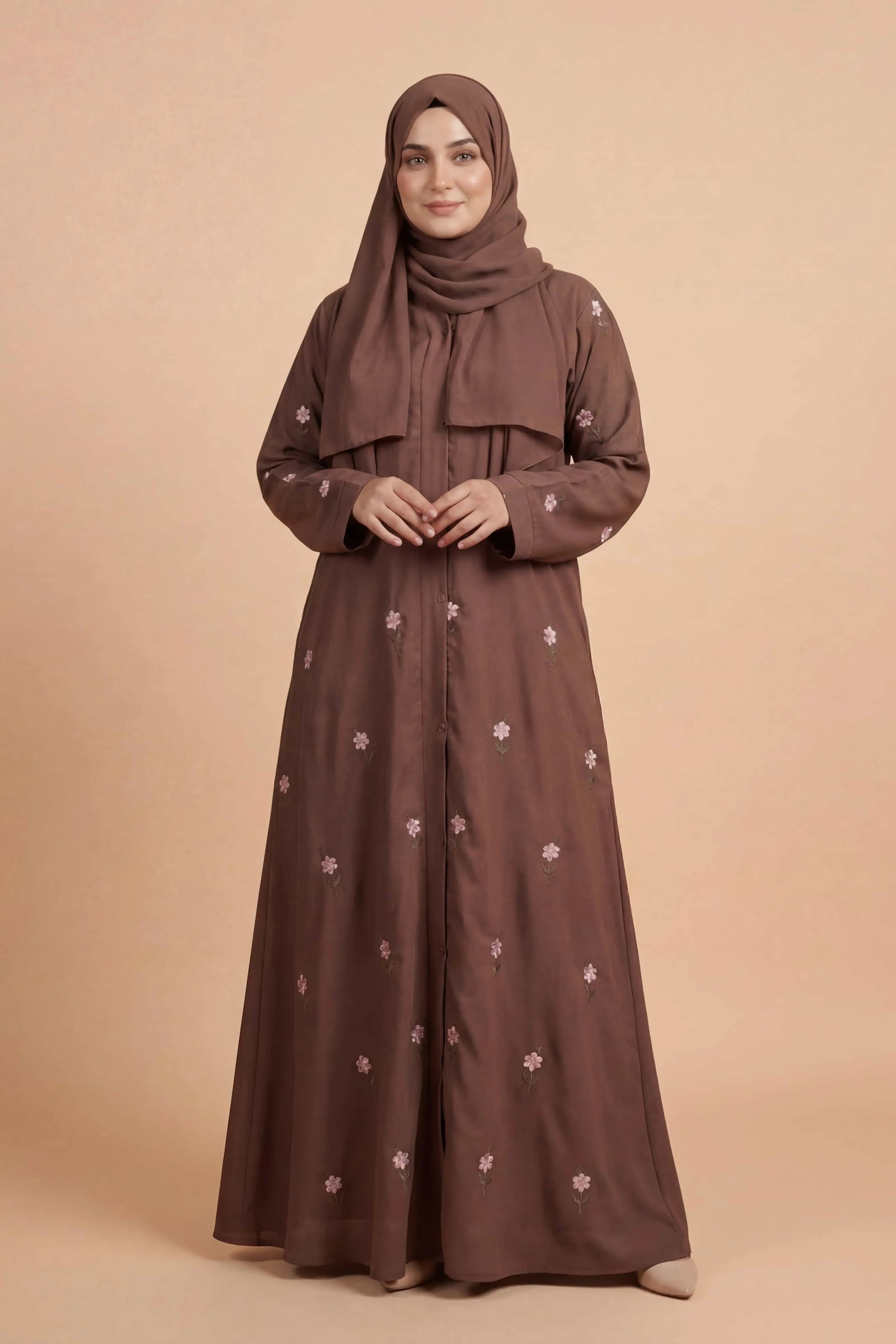 Product Overview: Rosy Night Brown  abaya combines modesty and comfort for a graceful everyday look.