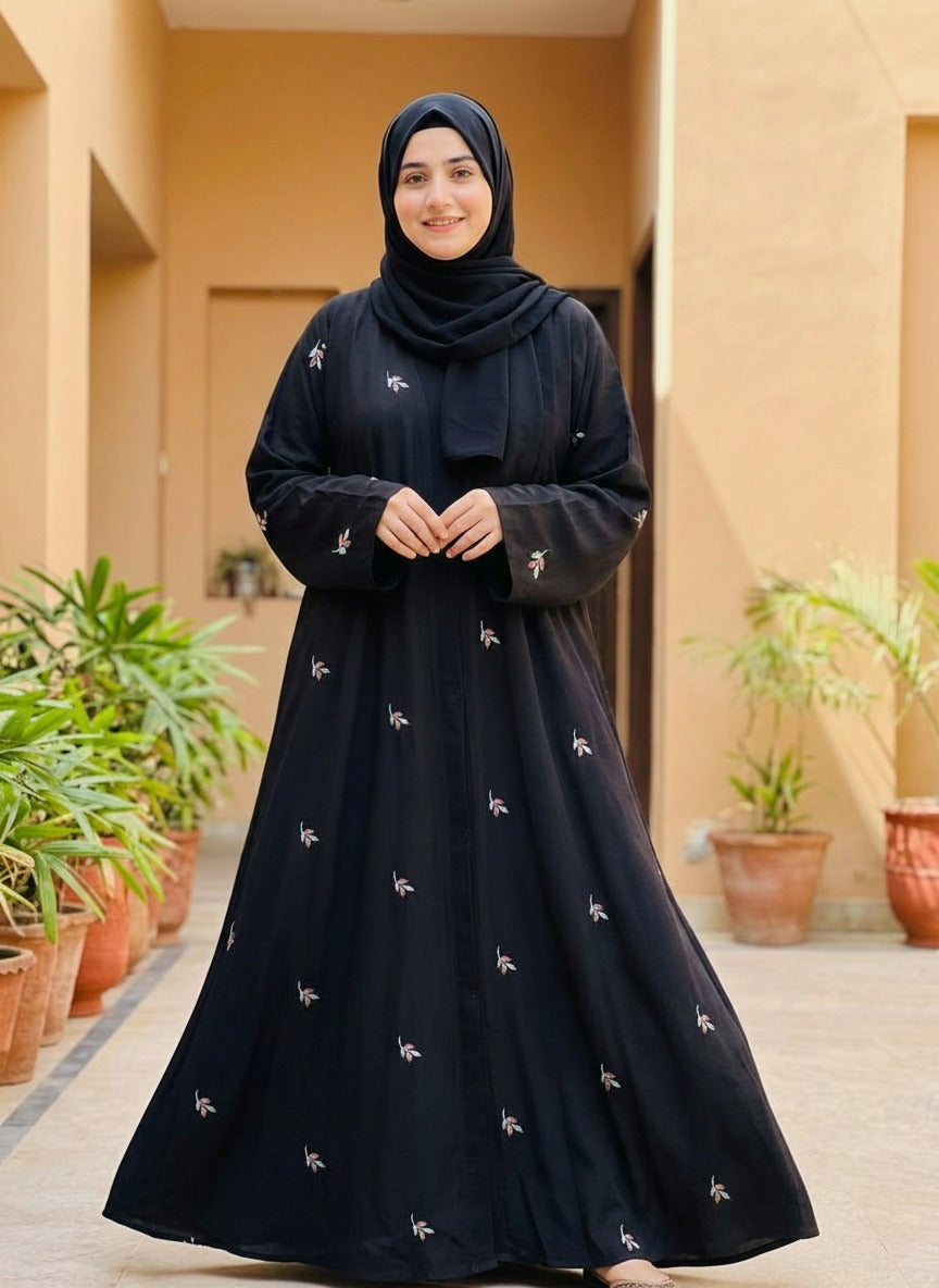 Leafy Black by Mala.pk is a premium embroidered abaya crafted from imported Korean fabric, offering a luxurious, soft, and comfortable feel — perfect for daily wear or special occasions.