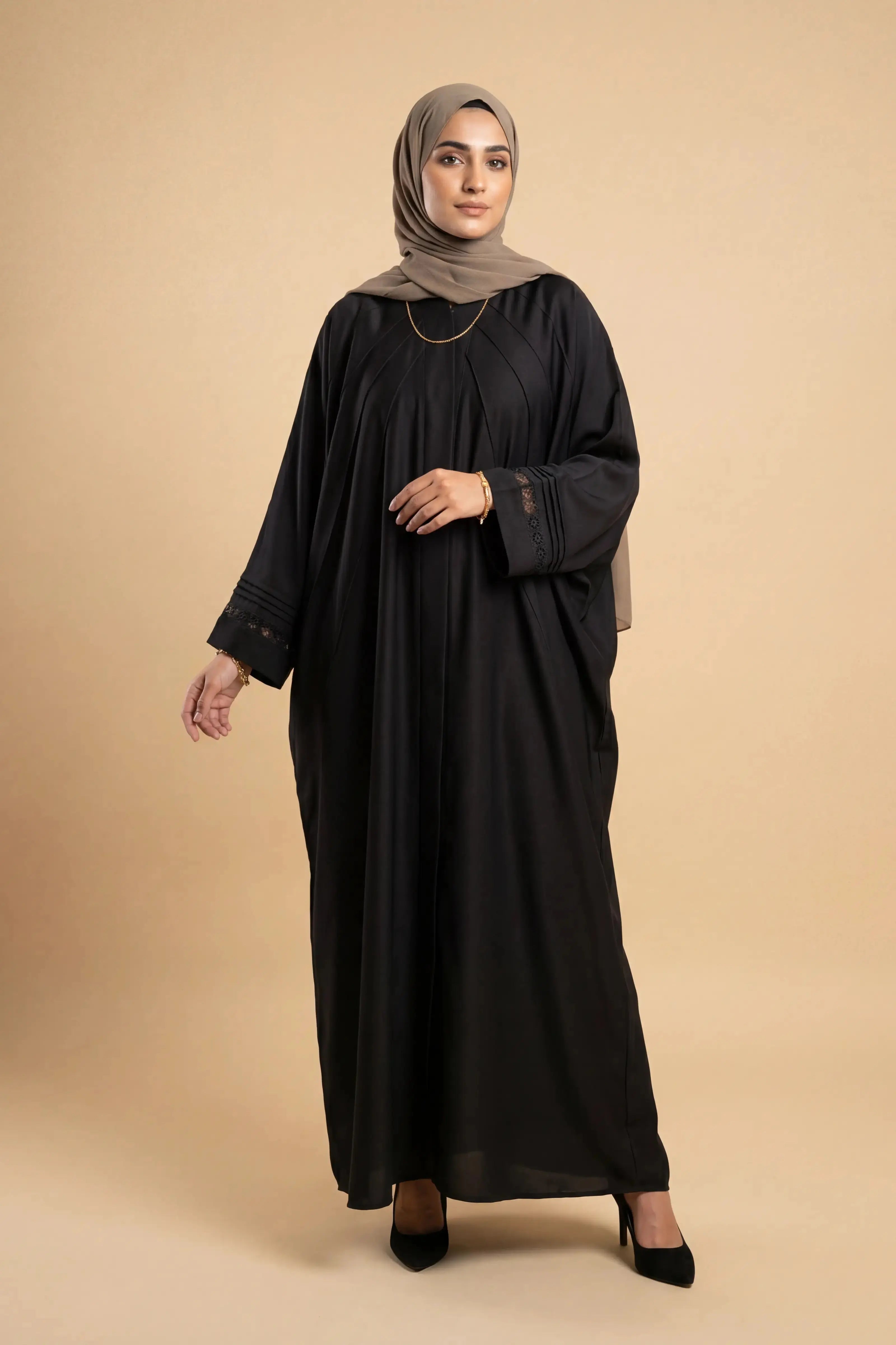 Rooh abaya by Mala.pk is a premium pintex design Front-Open crafted from imported Korean fabric, offering a luxurious, soft, and comfortable feel — perfect for daily wear or special occasions.